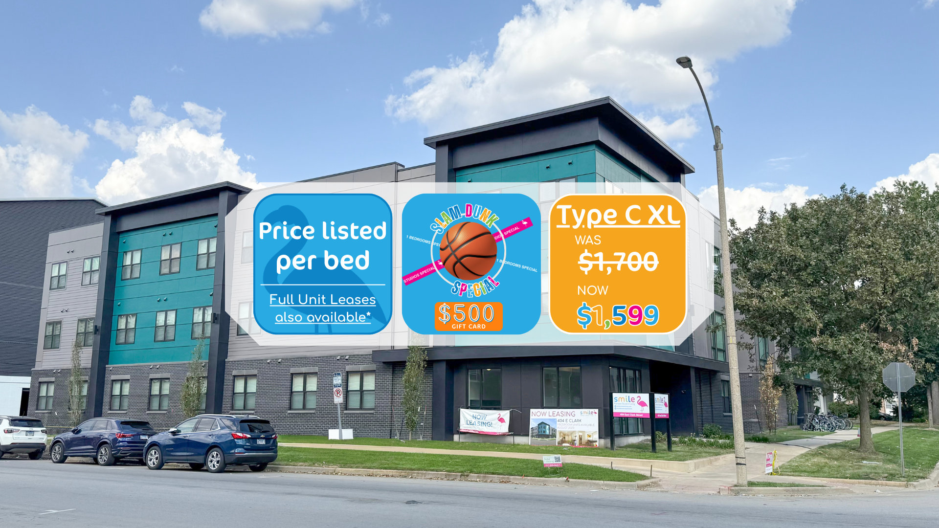 Prices displayed are for individual leases. This property offers both individual and joint and several leasing options. Please contact Smile Student Living for more information.