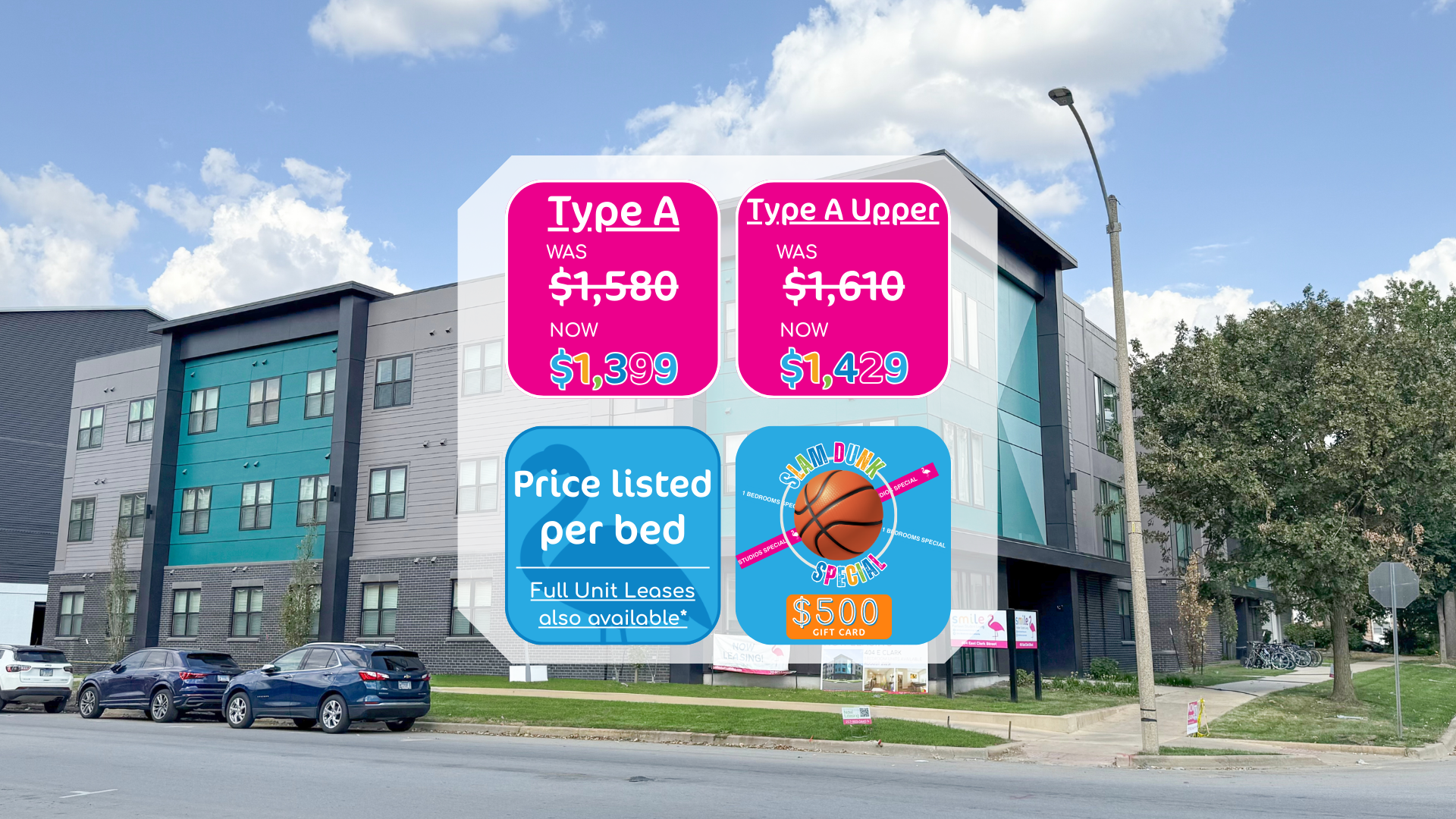 Prices displayed are for individual leases. This property offers both individual and joint and several leasing options. Please contact Smile Student Living for more information.